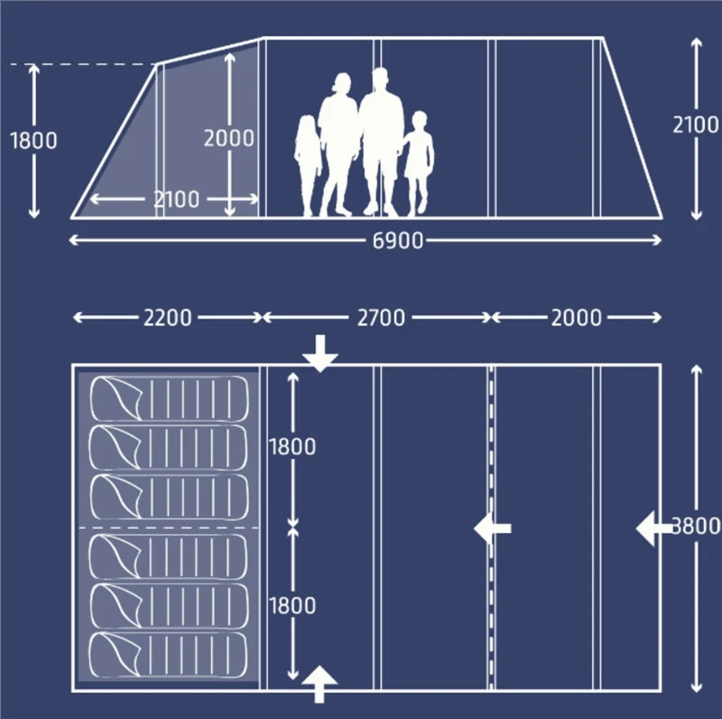 Kampa Hayling 6 Poled Tent Package 2021 Model – 3 section tunnel tent, spacious for the whole family.