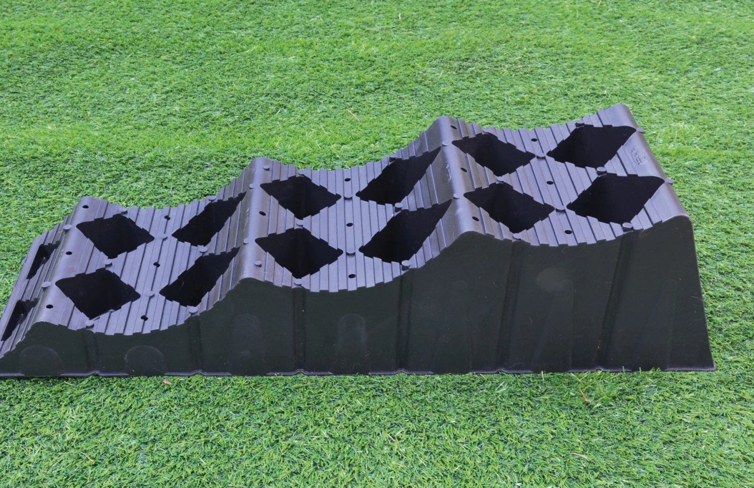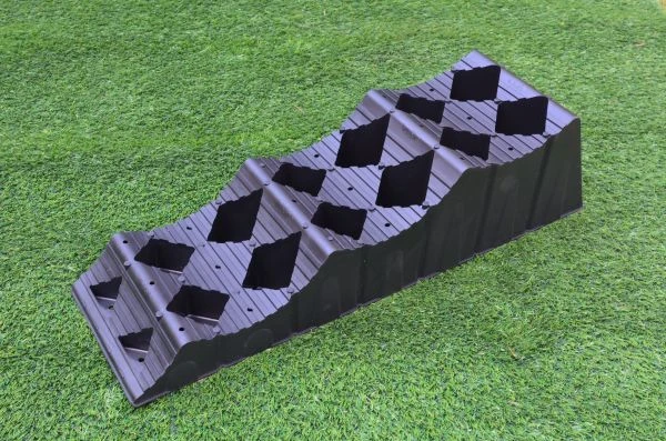 Unique and innovative Milenco design offering 3 step wheel pocketing, no need for chocks with a 50% base surface area to reduce sinkage on soft ground and sand, with 50% top surface.