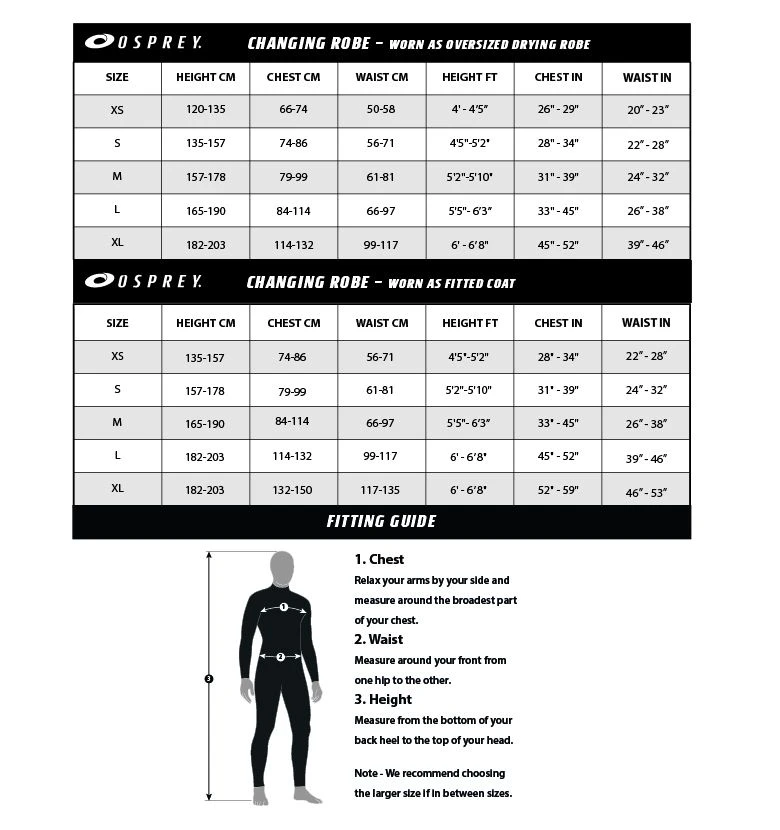 The new Osprey Changing Waterproof Long Sleeve Changing Robe is the ultimate outdoor changing robe. The waterproof outer shell keeps the wind and rain away while the fleece lining keeps you warm. Ideal for all outdoor and water sport and beach going activities. The towel has been designed from quality materials that will stand the test of time, are lighter than they appear and super soft. These robes provide insulation and warmth while you change or are just chilling in between sessions.